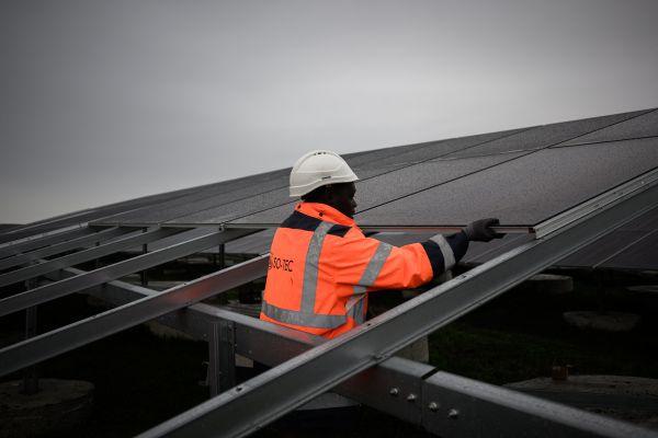 15日,一名工作人员在法国西南部波尔多的一个农场安装太阳能电池板。(法新社资料图片)
