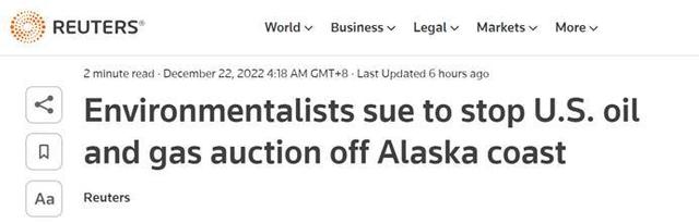 路透社报道:环保主义者提起诉讼,阻止阿拉斯加海岸石油和天然气钻探权出售