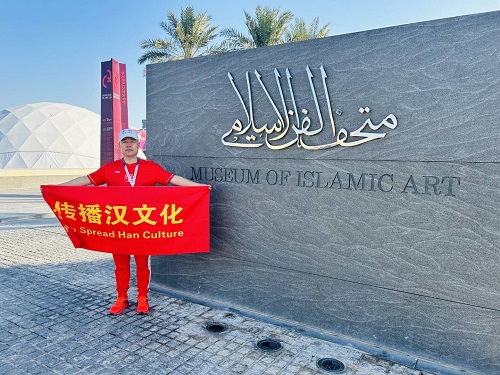 从11月26日当夜“球迷王子汉中李强”怀揣“重走丝绸路,传播汉文化”的梦想信念与初心使命,只身一人克服疫情防控的种种压力出现在卡塔尔世界杯大赛现场。每到一处,李强先生都会展开一面鲜艳的五星红旗和“重走丝绸路,传播汉文化”,“两汉三国,真美汉中”的红色手展条幅。