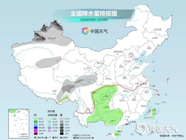 今明两天,西南部分地区和新疆北部多雨雪天气,公众出行请注意交通安全。尤其是新疆北部局地降雪较强,同时伴有大风,需警惕风吹雪,防范降雪对农牧业、交通运输等方面的不利影响。
