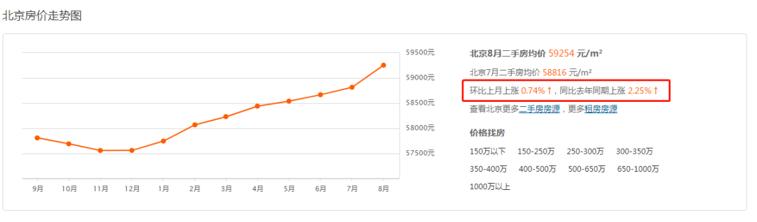 安居客房价走势:北京8月二手房均价 59254元/平,北京7月二手房均58816元/平。环比上月上涨 0.74% ,同比去年同期上涨2.25% 。
