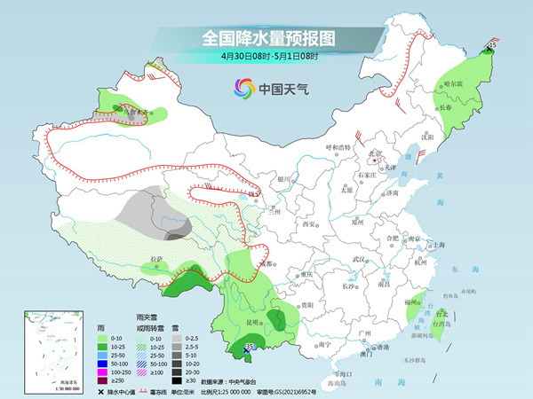 具体来看,中央气象台预计,今天,新疆沿天山高海拔地区、青藏高原大部有小到中雪或雨夹雪,局地有大雪;新疆伊犁河谷、西藏东南部、黑龙江中东部、吉林中东部、四川南部、云南、贵州西部、广西西北部、福建东部、台湾岛等地的部分地区有小到中雨,局地大雨(25~35毫米)。