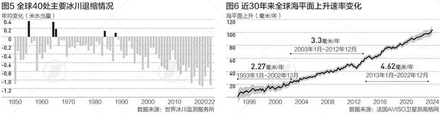 2022年,全球海平面上升的幅度达到自1993年开始卫星监测以来的新高。其中,在1993年~2002年的第一个十年中,全球海平面年均上升幅度约2.27毫米;到第二个十年(2003~2012年),这一上升幅度达到3.3毫米;在2013~2022年的最新十年中,上升幅度依旧在攀升,年均增幅达4.62毫米,为最初十年的2倍。