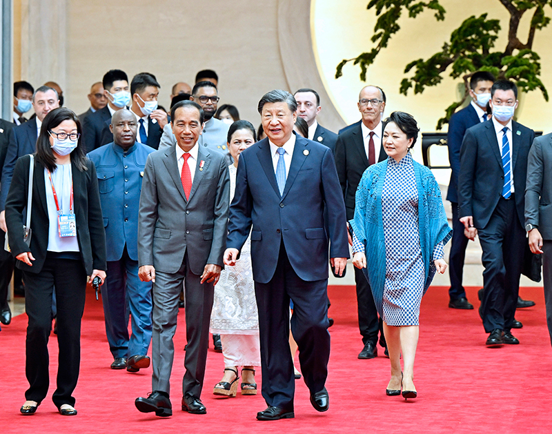 7月28日中午,国家主席习近平和夫人彭丽媛在四川省成都市金牛宾馆举行宴会,欢迎出席成都第31届世界大学生夏季运动会开幕式的国际贵宾。这是习近平和彭丽媛同贵宾们一起步入宴会厅。新华社记者 殷博古 摄