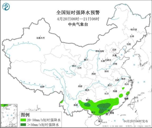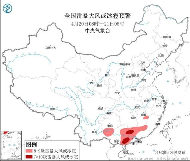 中央气象台4月20日06时继续发布强对流天气黄色预警:预计4月20日08时至21日08时,湖南南部、江西中南部、福建南部、贵州西南部、云南东南部、广西中东部、广东北部和中西部等地的部分地区将有8-10级雷暴大风或冰雹天气,其中广西东部、广东西部等地的部分地区将有10级以上雷暴大风,局地风力可达11级以上;湖南南部、江西南部、福建西部、贵州南部、云南东部、广西、广东中西部等地的部分地区将有小时雨量大于20毫米的短时强降水天气,其中广西东部和西北部、广东中西部等地的部分地区最大小时雨量大于50毫米,局地可达80毫米以上。