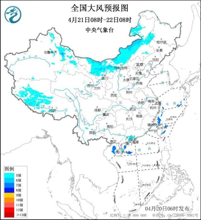 中央气象台4月20日06时继续发布大风蓝色预警:预计,4月20日08时至21日08时,新疆东部、甘肃西部、内蒙古北部等地的部分地区有5~6级、阵风7~8级的大风;黄海东南部海域、东海北部海域将有7~8级、阵风9级的大风。