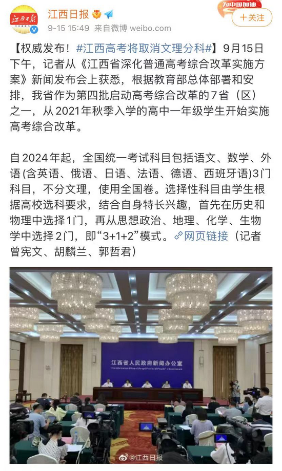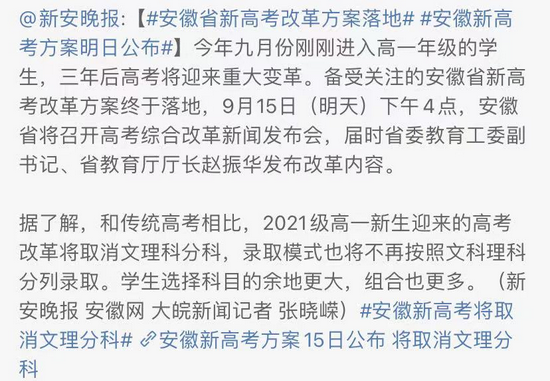 据@新安晚报 报道,9月15日下午,安徽也将召开高考综合改革新闻发布会。