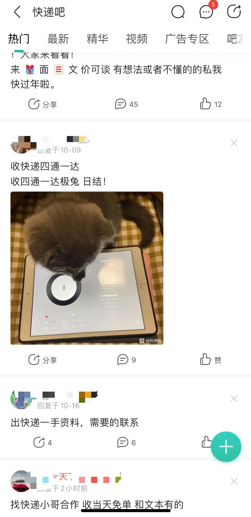 在百度贴吧“快递吧”“电子面单吧”“圆通吧”“快递员吧”等社群,出售和收购用户快递面单的网帖比比皆是。澎湃记者 秦山 图