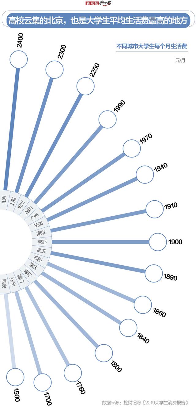 月均生活费超过2000元的城市,有北京、上海和杭州,而深圳、广州这些一线城市的大学生,月均生活费均接近2000元大关。