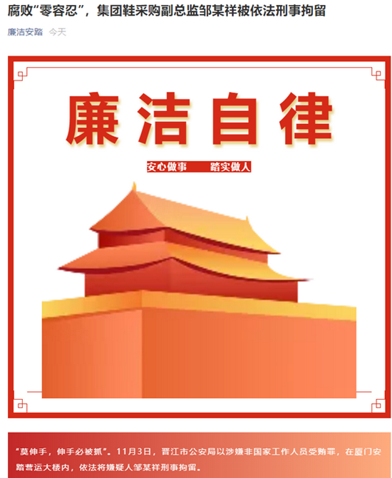 廉洁安踏还指出,11月3日,晋江市公安局以涉嫌非国家工作人员受贿罪,在厦门安踏营运大楼内,依法将嫌疑人邹某祥刑事拘留。
