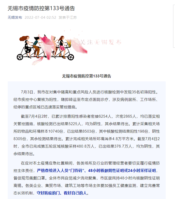 7月3日,江苏省无锡市在对集中隔离和重点风险人员进行核酸检测中发现35名初筛阳性。经市疾控中心复核为阳性,随即转运至市定点医院诊疗,涉及病例居所、工作场所、经停的重点区域已迅速落实管控措施。